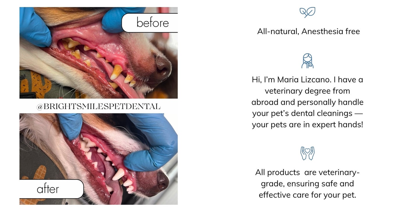 At Bright Smiles Pet Dental, I believe in treating every pet like a cherished family member. I understand that many pet owners are concerned about the use of anesthesia, especially for routine dental cleanings. While anesthesia is often used in traditional veterinary practices, it carries inherent risks and may not be the best option for older pets or those with specific health conditions. That's why I offer non-anesthetic cosmetic dental cleanings as a safe, effective, and stress-free alternative—prioritizing your pet's safety, comfort, and overall well-being.